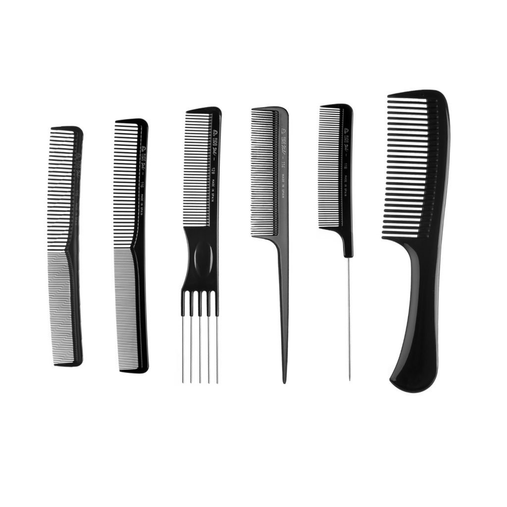 Frizerski set češljeva, osnovni češljevi za rad u salonu. Olakšavaju raščešljavanje i oblikovanje. Set sadrži češalj s ručkom, češljeve štilkam sa plastičnim i metalnom iglom za razdjeljivanje kose, dva češlja za šišanje i oblikovanje, te češalj za tapiranje. Boja: Crna.