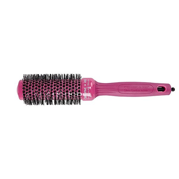 Visoko kvalitetna okrugla četka za feniranje obložena keramikom i najlon iglicama u trendi rozoj boji. Ionizirana tehnologija hidratizira kutikulu i daje kosi sjaj. Napravljena s jakim protokom zraka za brže sušenje kose. Četka ima jedinstveni patentirani dizajn ergonomske drške koji sprječava zapinjanje i čupanje kose. Uključuje odvojivi špic za razdvajanje kose. Promjer 35 mm.