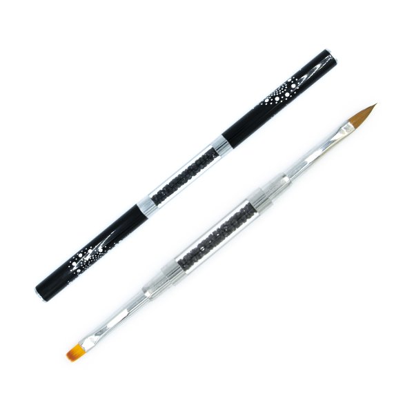 Profesionalna dvostrana četkica od prirodne dlake za izlijevanje, nadogradnju i dopunu noktiju u gel i akril tehnici. Drška četkice je izrađena od metala i poklopcima crne boje koji su ukrašeni cirkonima. Karakteristika prirodna dlake je da zadržava određenu količinu tečnosti što olakšava rad i kontrolu materijala u toku rada.