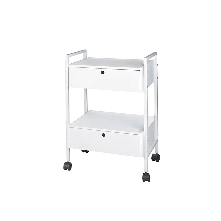 Bijela kolica s metalne strukture opremljena s 2 police i 2 ladice, za postavljanje stolnih uređaja ili za pohranu više kozmetičkih dodataka. Potpuno su mobilna zahvaljujući 4 kotača. Veličina proizvoda: 55,5x37x82 cm. Težina: 20,5 kg.
