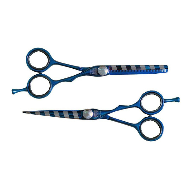 Set koji uključuje 1 klasične škare za šišanje, te škare za stanjivanje kose sa 38 zubaca veličine 5,5″ (14cm). Karakteriziraju ih oštrice s prugastom “zebra” završnom obradom kako bi škare bile trajnije, a šišanje išlo tečno. Oštrice su naoštrene po “Diamond Sharp” sistemu. Škare su izrađene od nehrđajućeg čelika, s plavom završnicom od titan-nitrita. Posjeduju lako podesiv zatezni vijak.